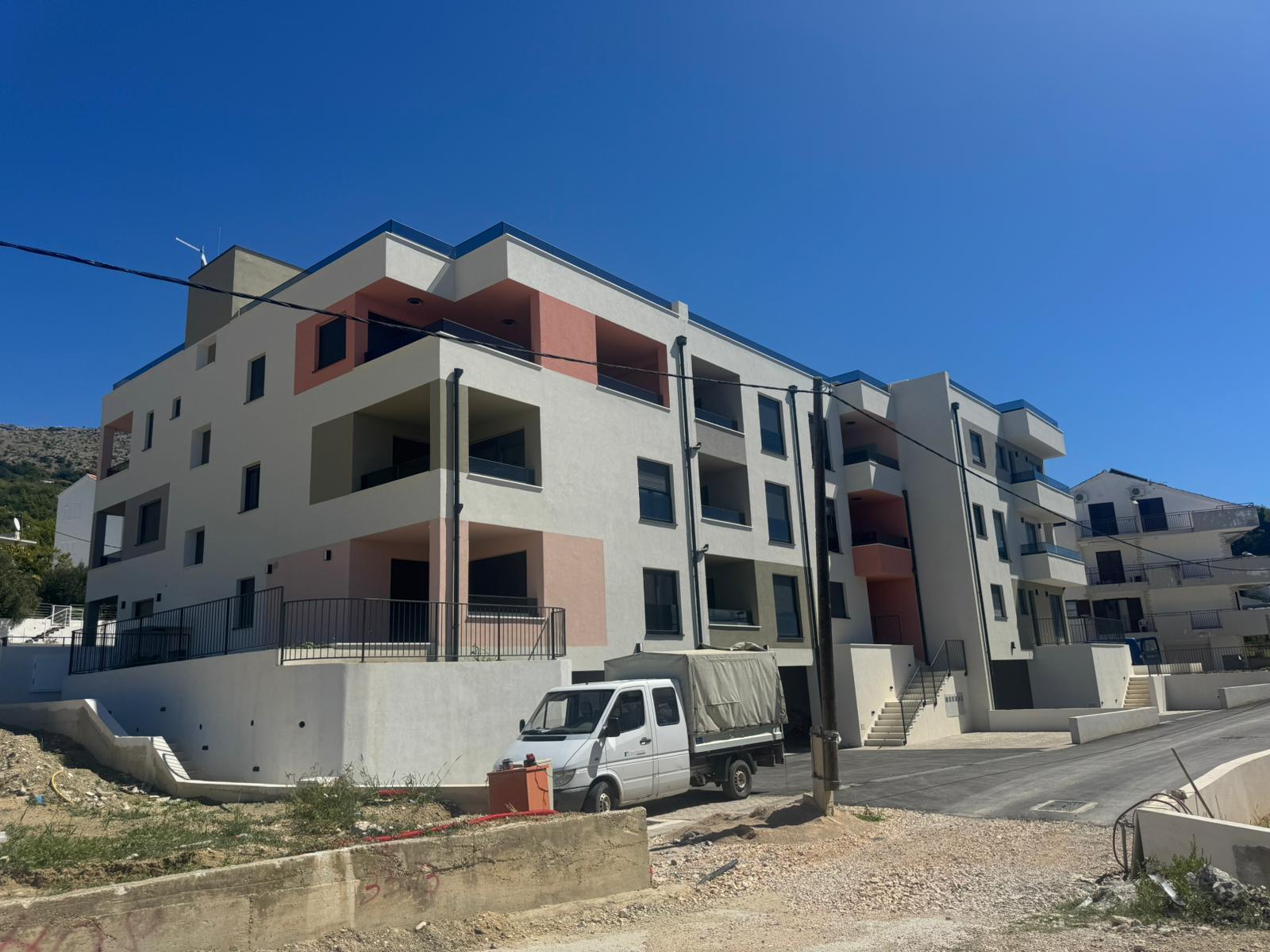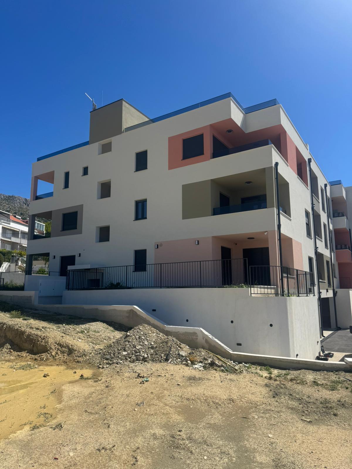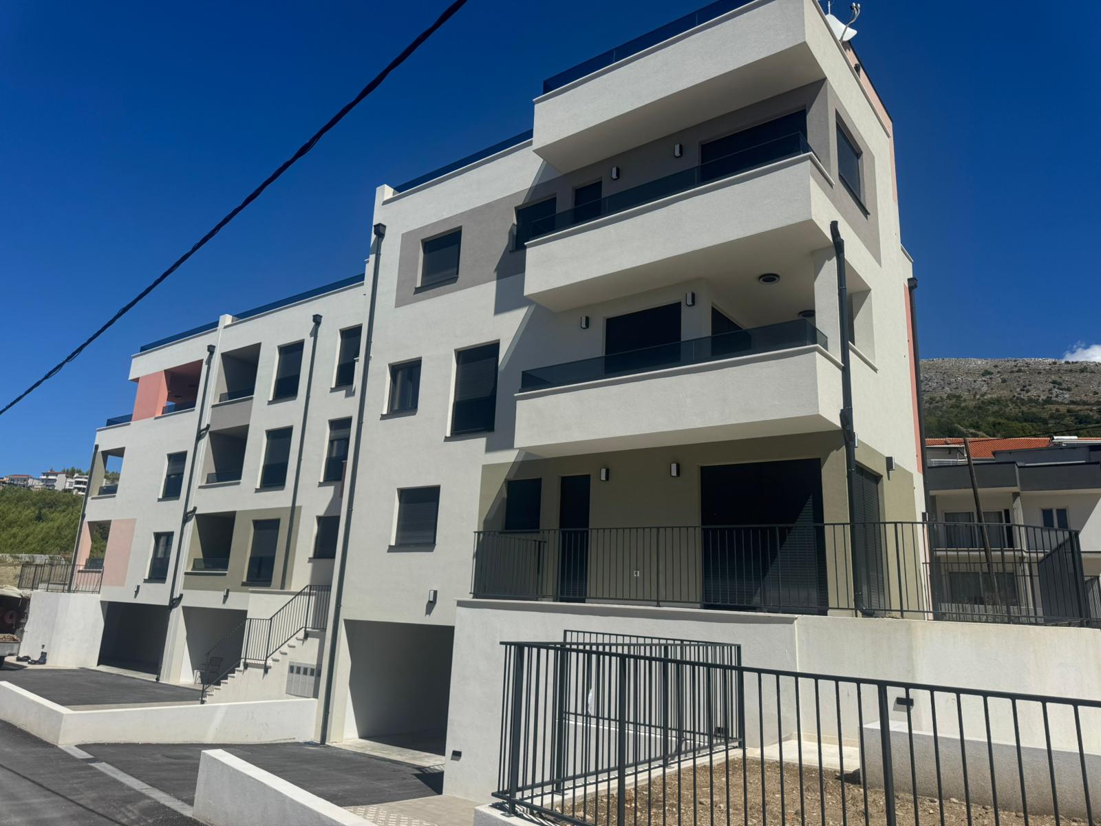 Tri stambene zgrade u nizu s po 5 stambenih jedinica (ukupno 15 stanova) u Podstrani, oko 500 m od obale i 10 min od Splita. Katnost: Po+P+2K.