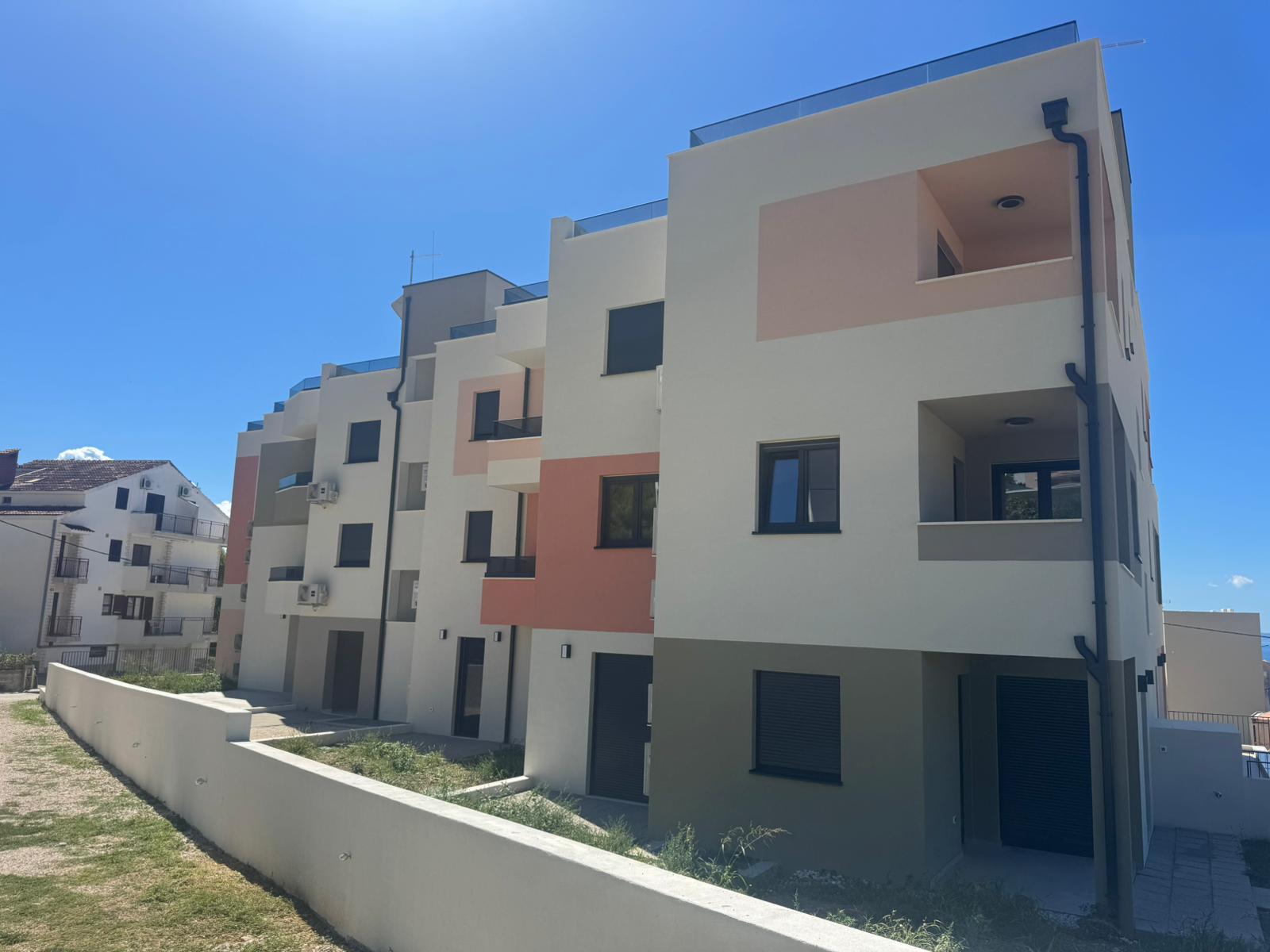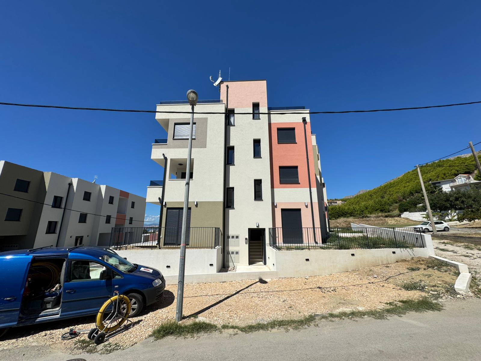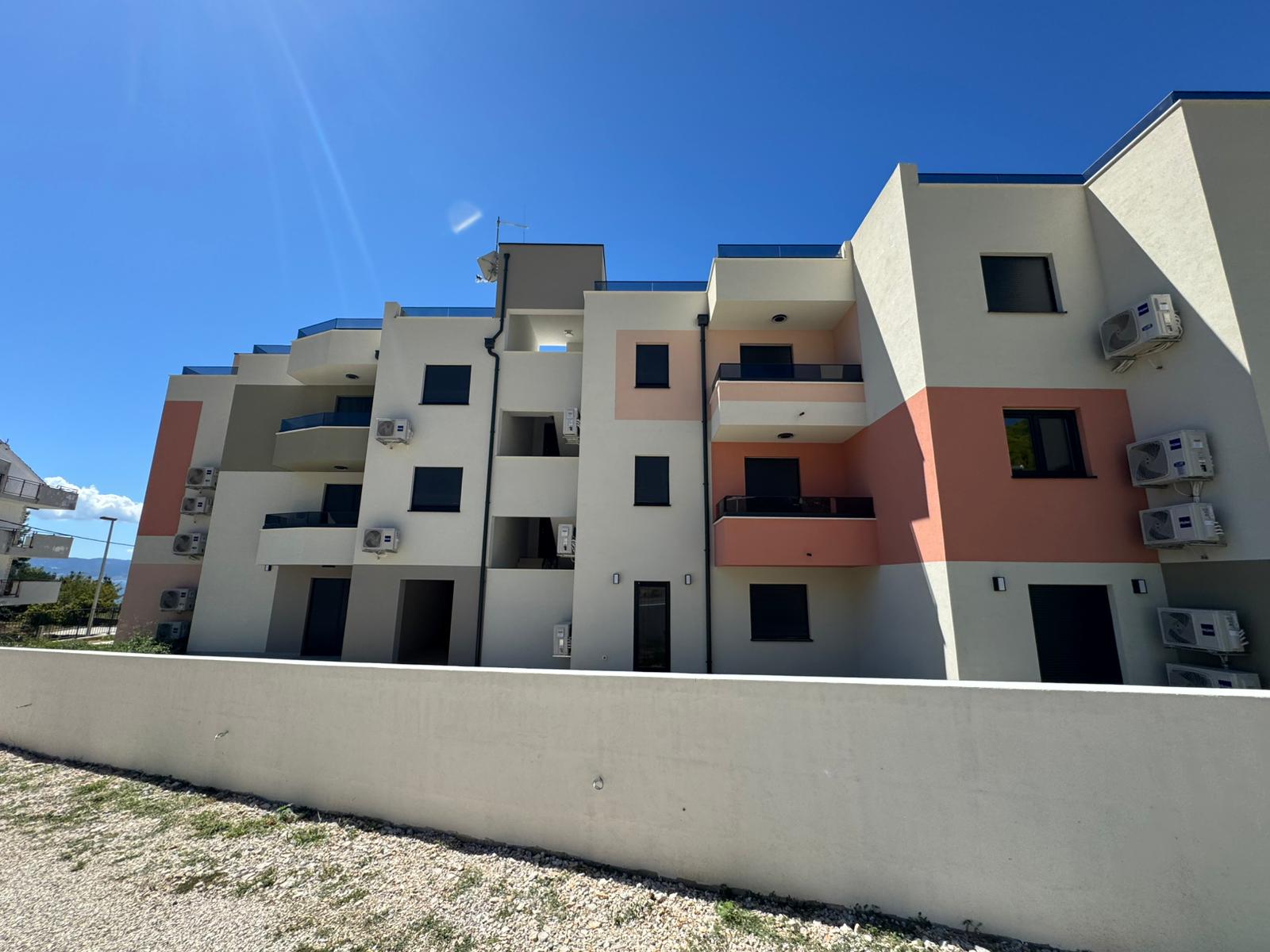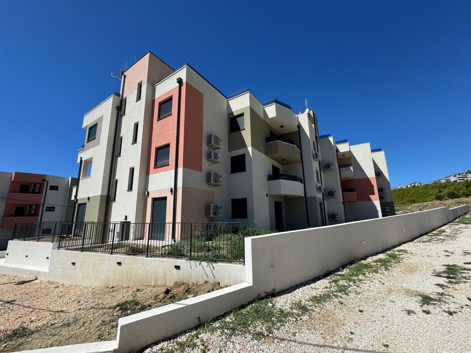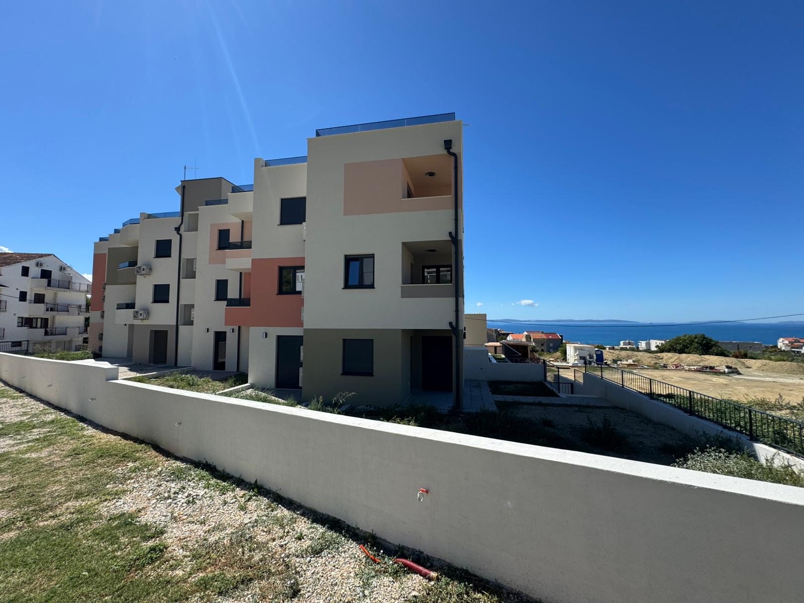 Tri stambene zgrade u nizu s po 5 stambenih jedinica (ukupno 15 stanova) u Podstrani, oko 500 m od obale i 10 min od Splita. Katnost: Po+P+2K.